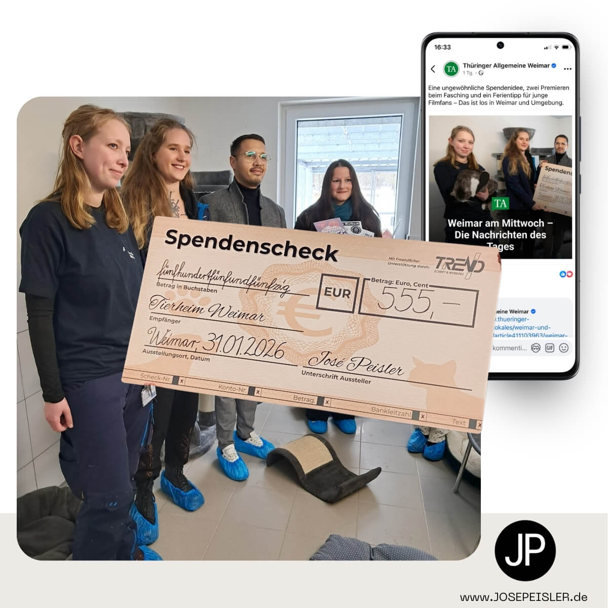 Wie geplant konnte ich exakt 1 Jahr später die erste Spende offiziell an das Tierheim Weimar übergeben. Genauer gesagt konnte ich den Spendenscheck direkt am 31.01.2026 überreichen.